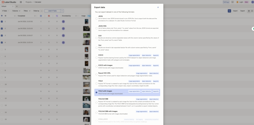 在实际操作过程,发现数据标注软件 label-studio 和 yolo 有部分依赖重叠,但要求版本不同。因此,建议分别为他们建立一个独立的环境。环境管理因为之前已经安装了 anaconda ,就使用它不做变更。 如果觉得 anaconda 太臃肿,可以使用 miniconda 或者 uv ; 当然,如果你已经安装了 3.11 或以上版本的 python ,用自带的 pyenv 也可以。但这里,我们以 anaconda 为标准。